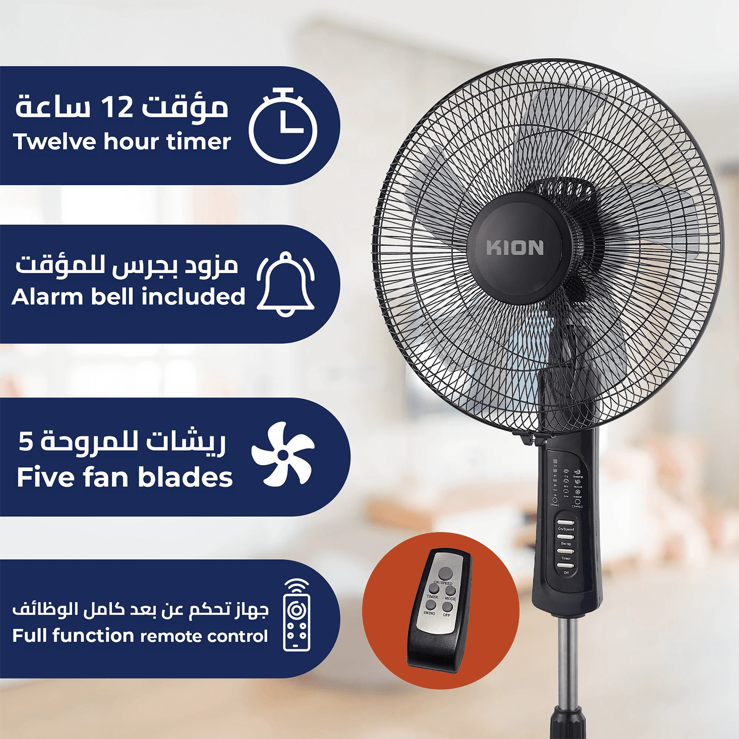 مروحة ستاند كيون , 16 بوصة , 5 شفرات بلاستيك , 3 سرعات , ريموت كنترول , اسود , 65 وات